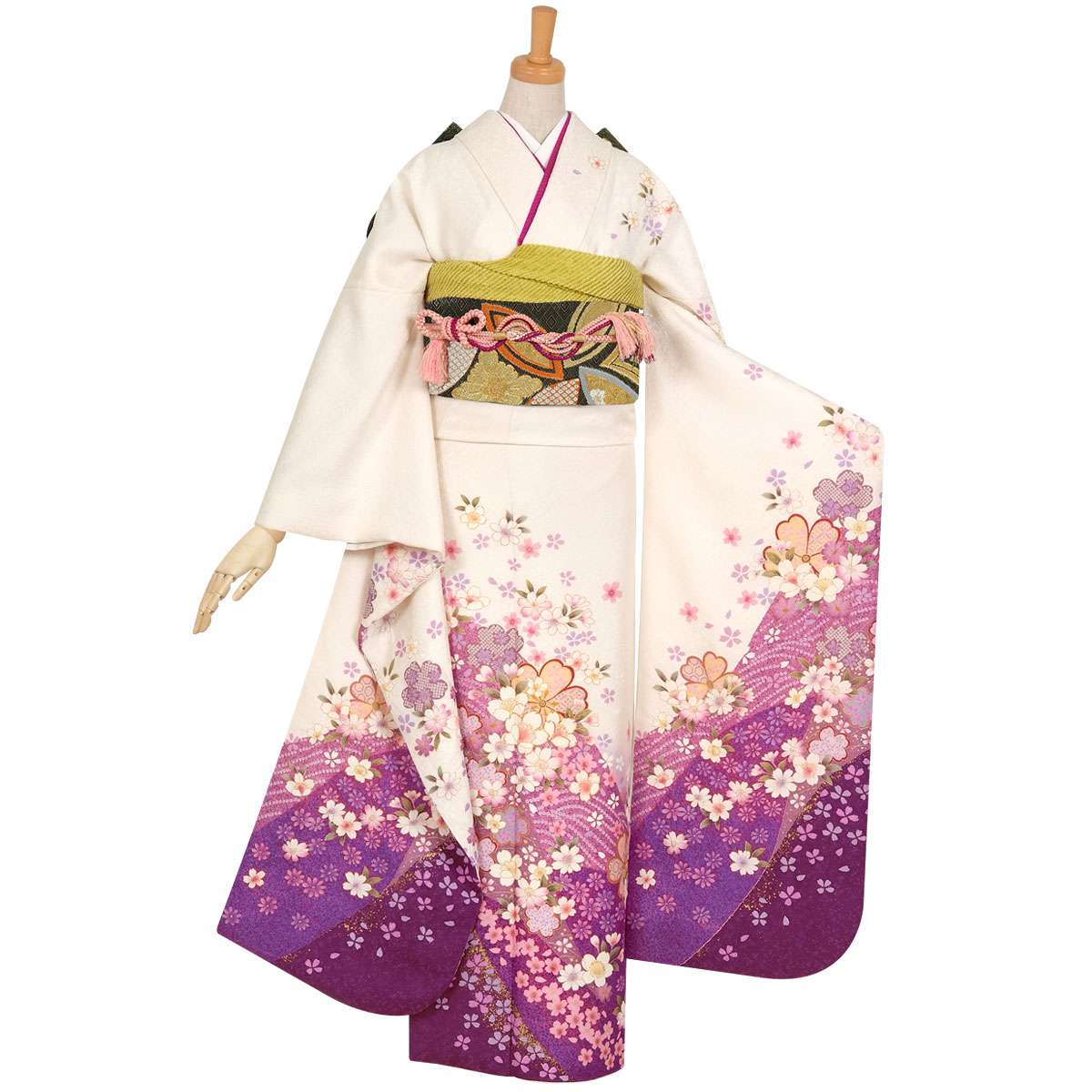 【セット内容】 1) 振袖 2) 袋帯 3) 帯締め 4) 帯揚げ 5) 長襦袢(刺繍半衿付き) 6) 草履&バッグ 7) 肌着(きものスリップ) 8) 衿芯 9) 重ね衿(伊達衿) 10) 帯板(前板/後板) 11) コーリンベルト 12) 三重仮紐 13) 腰紐5本 14) 帯枕 15) 伊達締め2本 16)足袋(サービス品)