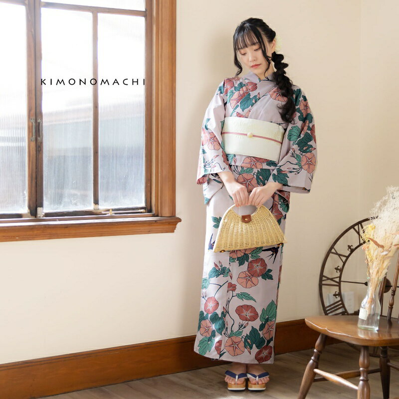 【商品名】浴衣 レンタル|ピンクグレー 朝顔に燕