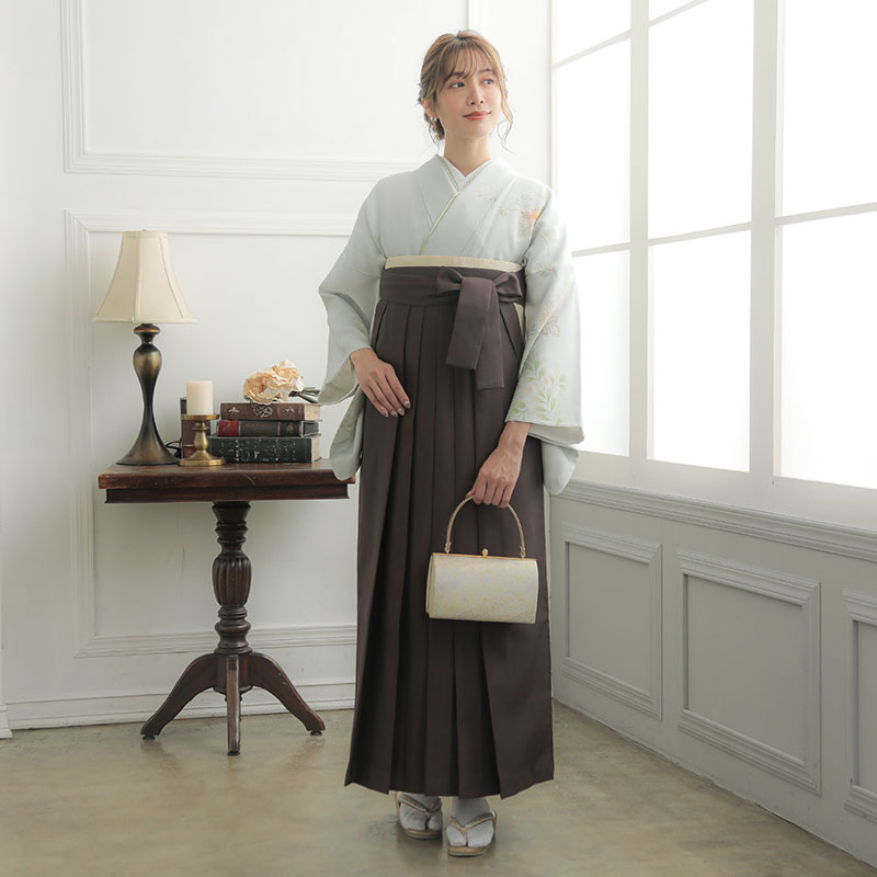 1) 訪問着 2) 袴 3) 半幅帯 4) 重ね衿(伊達衿) 5) 半衿(襦袢につけた状態でお届け) 6) 肌着(きものスリップ)7) 長襦袢 8) コーリンベルト 9) 帯板 10) 衿芯 11) 腰紐5本 12) 伊達締め2本 13) 草履 14)足袋(サービス品) ★お客様でご用意いただくのは補正用具(タオル等)だけでOK!★髪飾りやバッグはオプションでご用意しています。