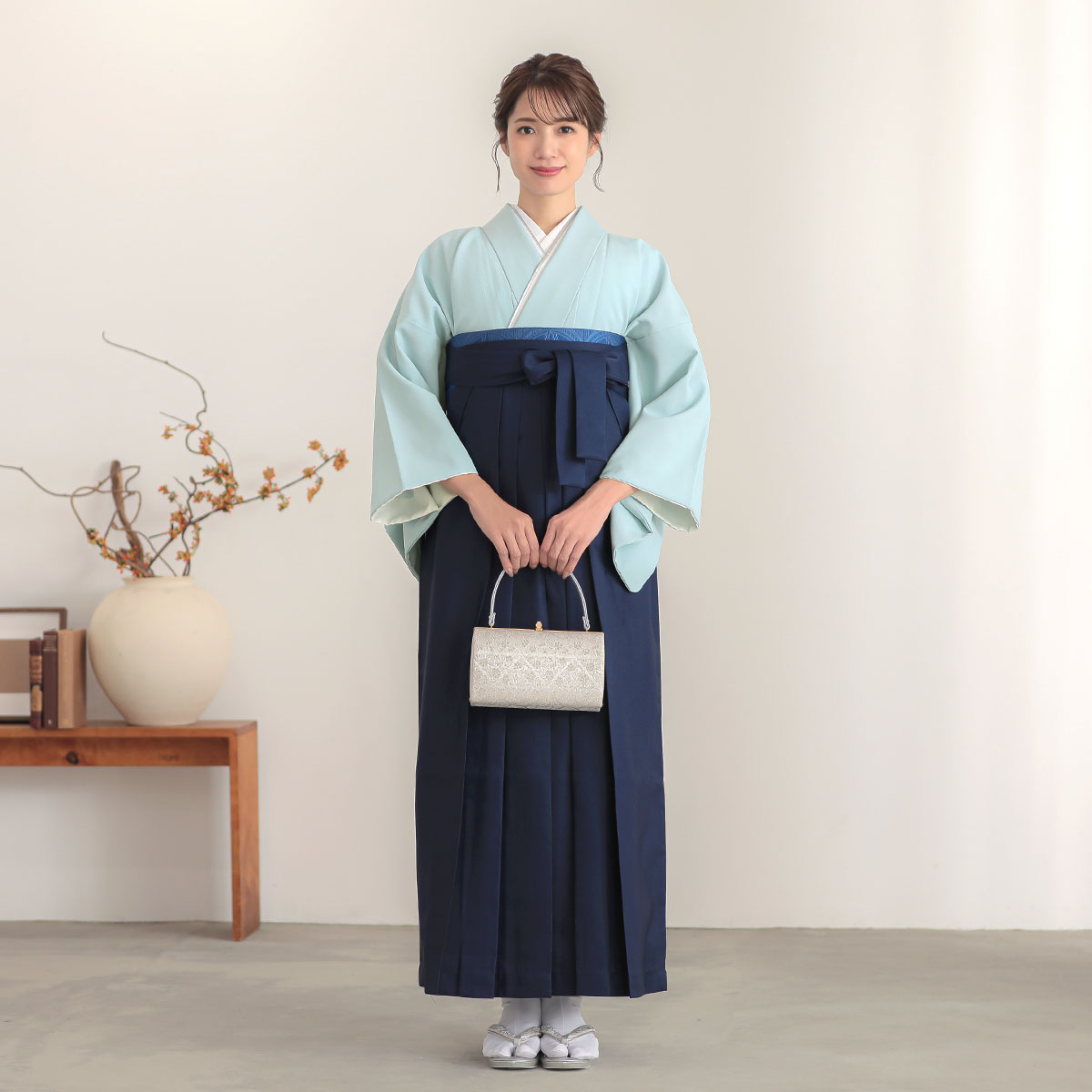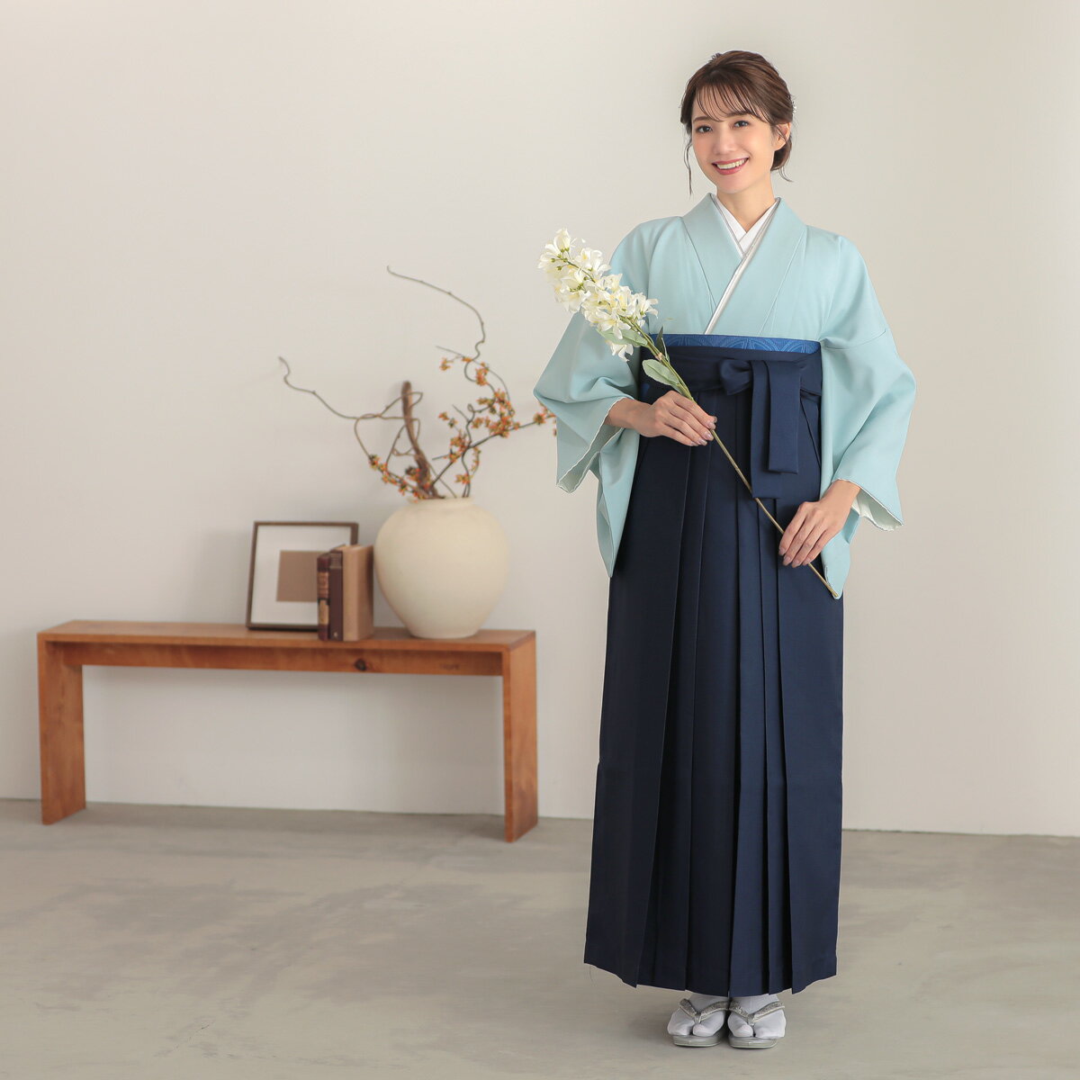 1) 訪問着 2) 袴 3) 半幅帯 4) 重ね衿(伊達衿) 5) 半衿(襦袢につけた状態でお届け) 6) 肌着(きものスリップ)7) 長襦袢 8) コーリンベルト 9) 帯板 10) 衿芯 11) 腰紐5本 12) 伊達締め2本 13) 草履 14)足袋(サービス品) ★お客様でご用意いただくのは補正用具(タオル等)だけでOK!★髪飾りやバッグはオプションでご用意しています。