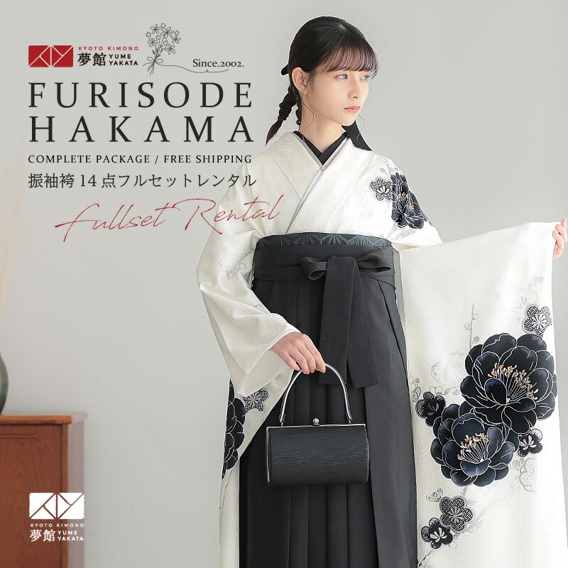 【セット内容】 1) 振袖 2) 袴 3) 半幅帯 4) 重ね衿(伊達衿) 5) 草履・バッグ 6) 肌着(きものスリップ)7) 長襦袢(着物に合った色柄で、衿は刺繍を施した半衿付き) 8) コーリンベルト 9) 帯板 10) 衿芯 11) 腰紐5本 12) 伊達締め2本 13) 足袋(サービス品)