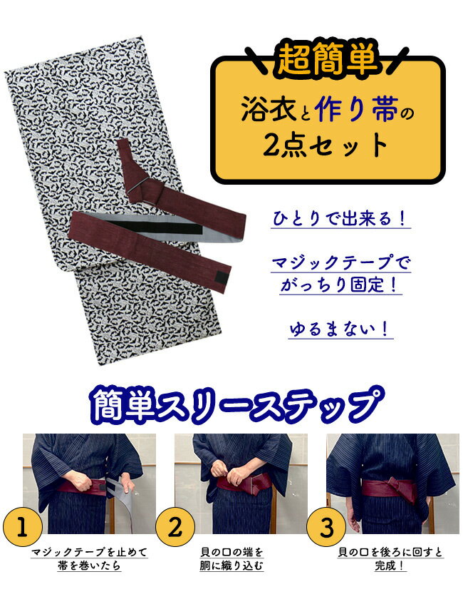 kimonocafe kimono styleメンズ浴衣セット登場!マジックテープでがっちり固定する簡単なつくり帯のセットだから初心者さんでも楽に着られます。