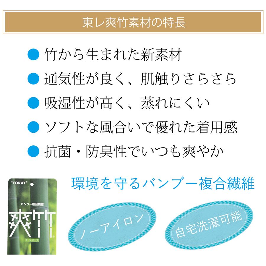 <東レ爽竹素材の特徴> ・竹から生まれた新素材 ・通気性が良く、肌触りさらさら ・吸湿性が高く、蒸れにくい ・ソフトな風合いで優れた着用感 ・抗菌・防臭性でいつも爽やか <着用時期について> 通気性のある薄手の生地なので真冬を除いて春・夏・秋と3シーズン対応で着用いただけます。