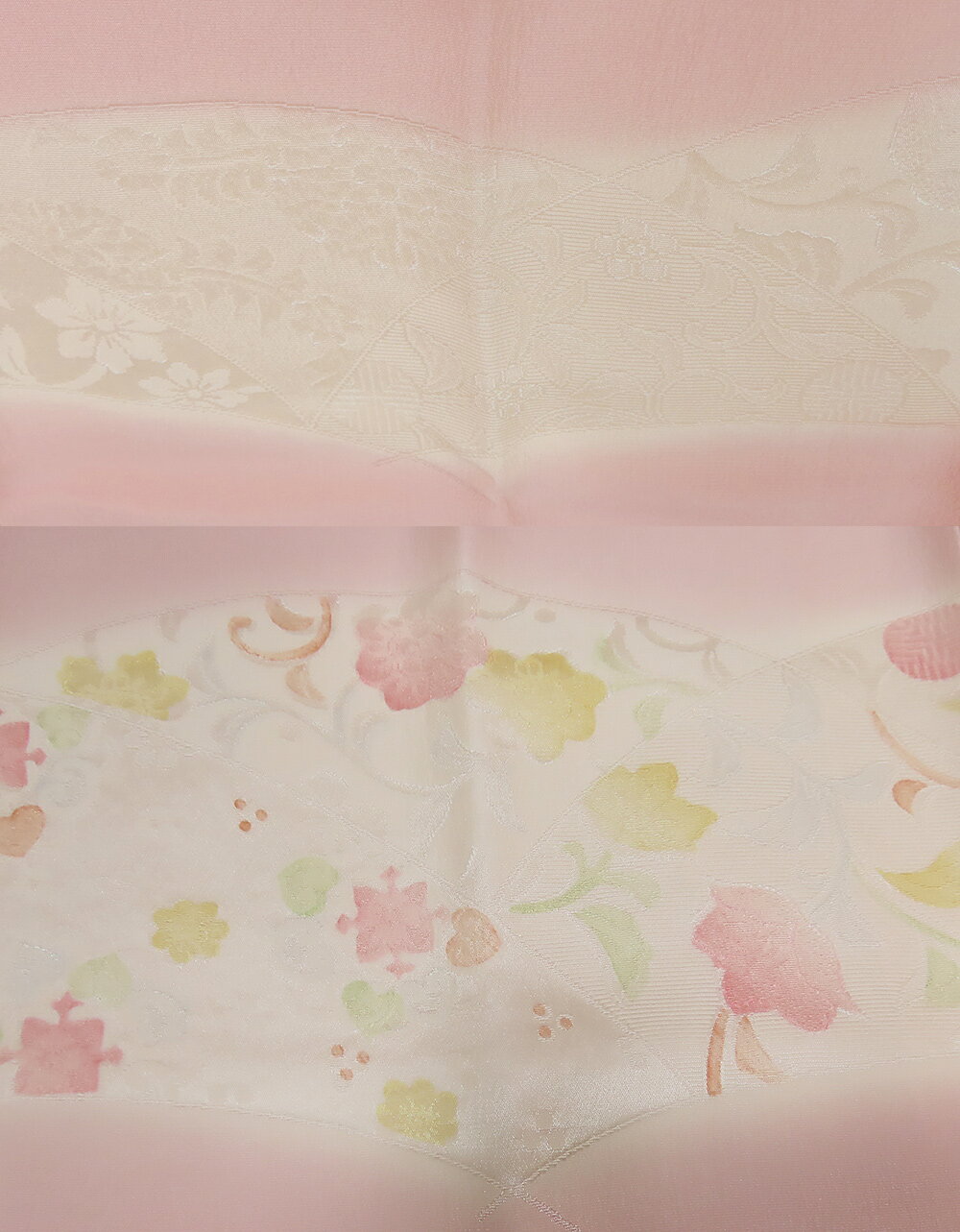花柄などの地模様を施した生地に 薄ピンクの地色を染め上げた 袷仕立ての正絹 長襦袢です。