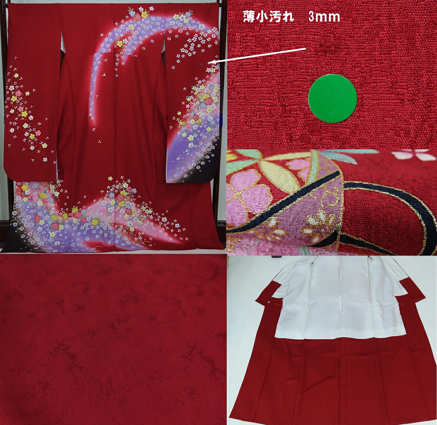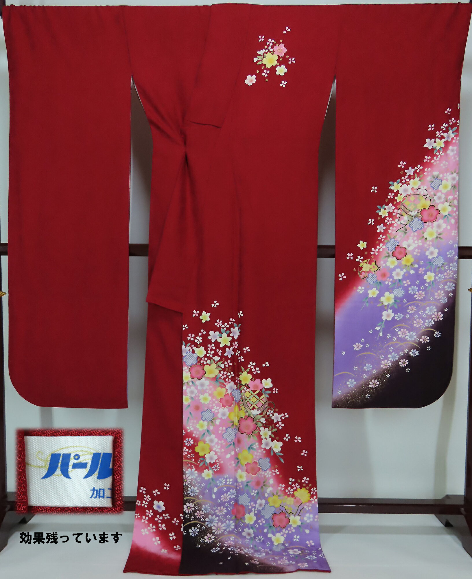 さらりとした上質な紋意匠の生地に 赤、藤色、ピンクの地色と花柄、鹿の子 マリなどの柄を染め上げた振袖です。