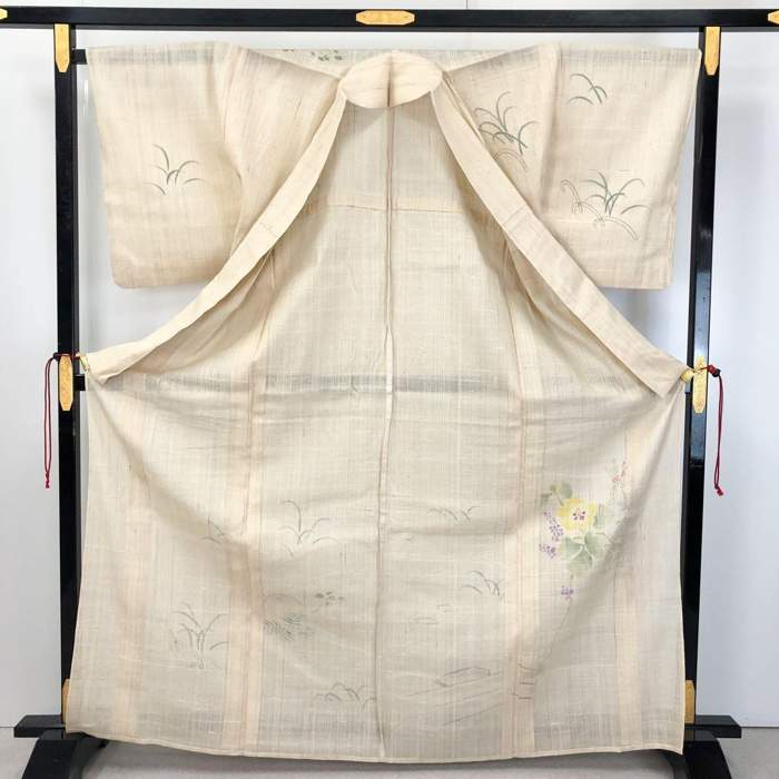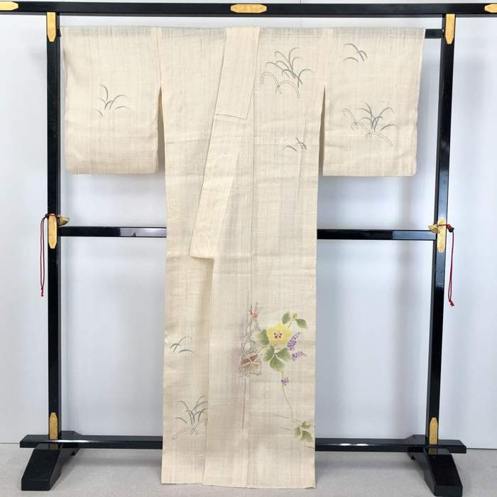 乳白色の自然な風合いの薄手の紬地に手描きの花草模様の柄裄がデザインされた素敵なお品でございます。