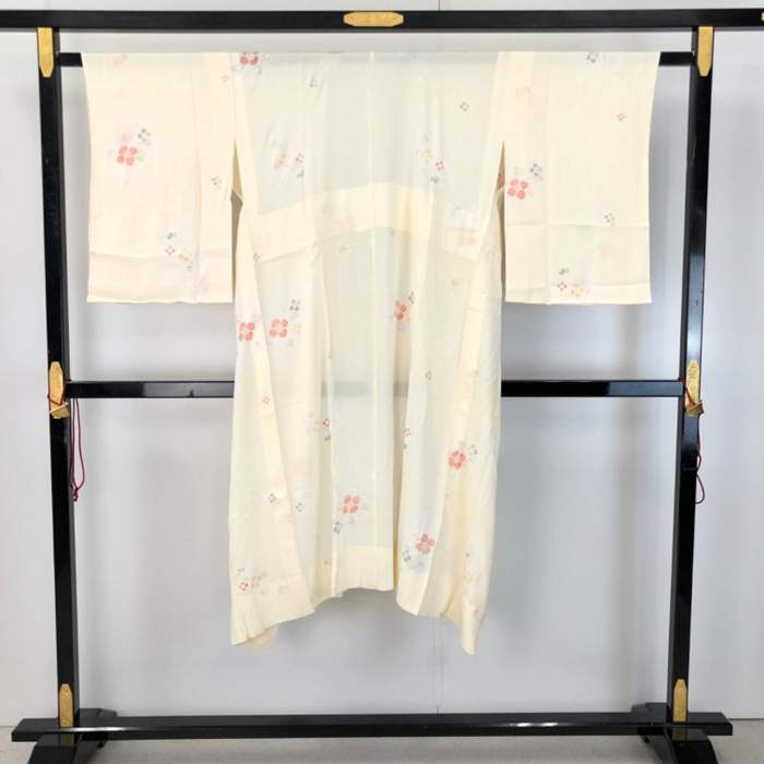薄卵色に花模様の柄裄がデザインされた素敵なお品でございます。