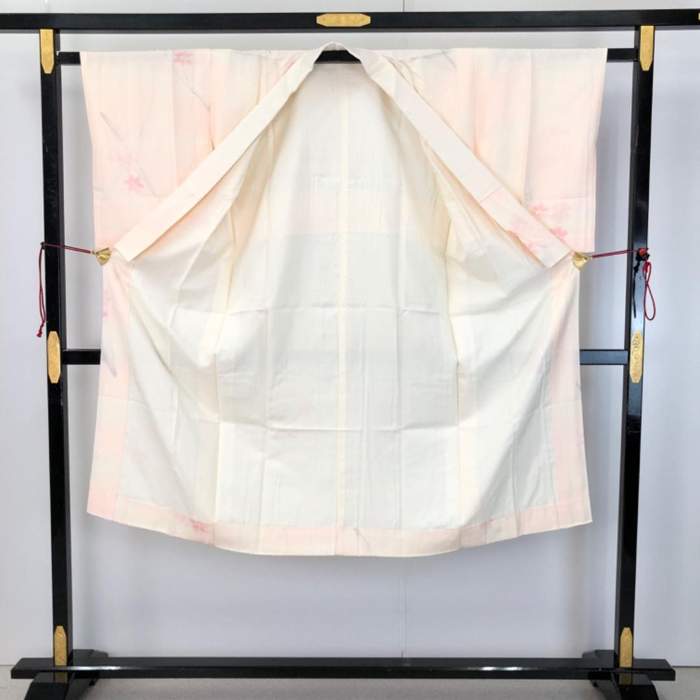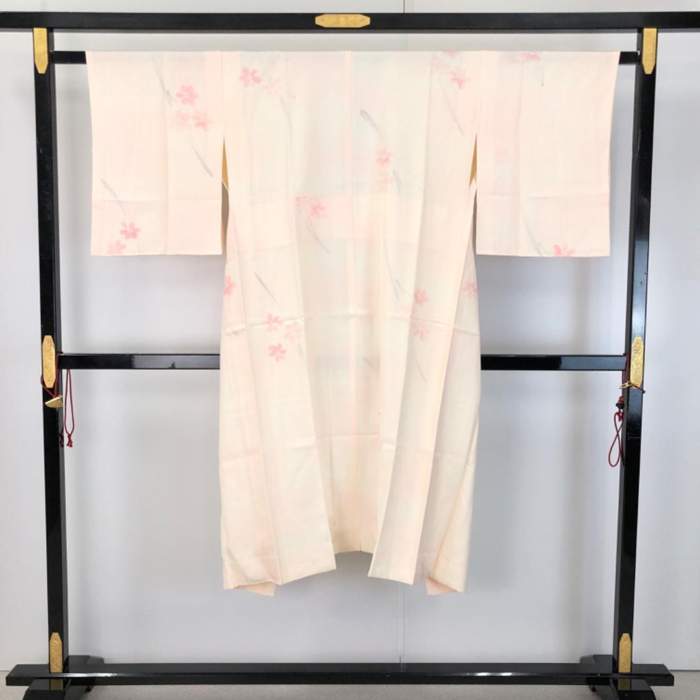 薄乙女色のお色味に手描きの花模様がデザインされた素敵な柄裄のお品でございます。