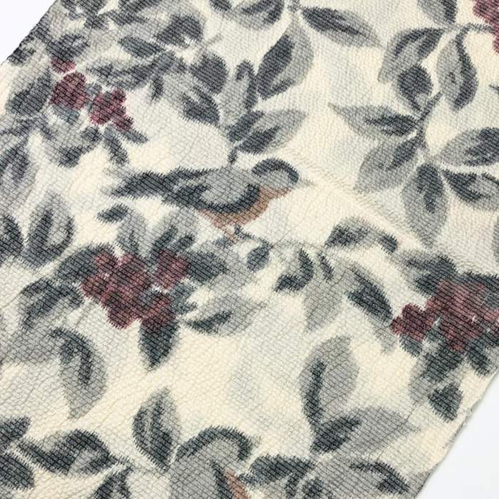 -素材-正絹-管理番号-C-6533和装小物 帯揚げ 正絹 花に葉模様 鳥 乳白色 C-6533訪問着 付下げ 附下 付け下げ 振袖 紬 大島紬 色無地 留袖 色留袖 浴衣 道中着 和装コート 和装小物 長襦袢七五三 袋帯 名古屋帯 半幅帯 中古着物 リサイクル リユース アンティーク商品詳細 説明正絹の帯揚げです。