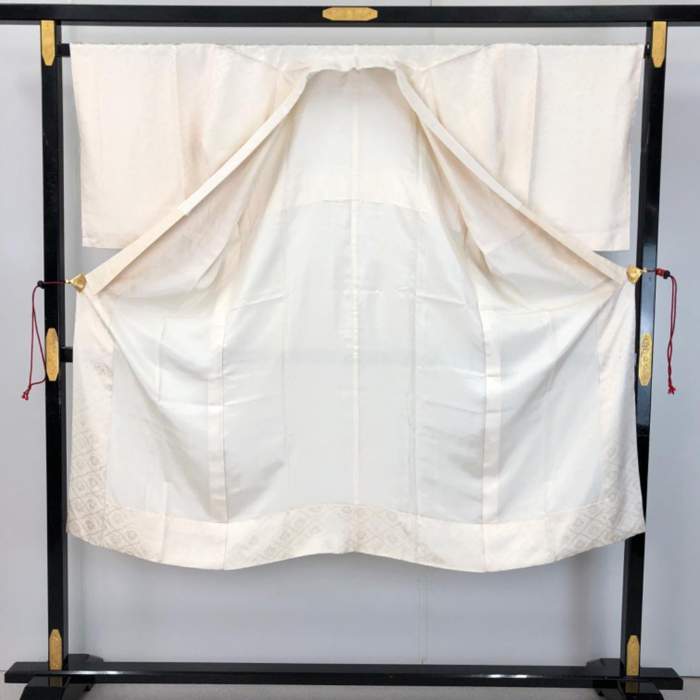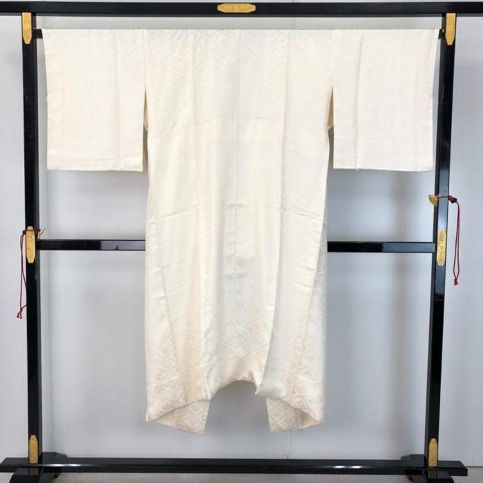 乳白色のお色味に松皮菱、花模様がデザインされた素敵な柄裄のお品でございます。