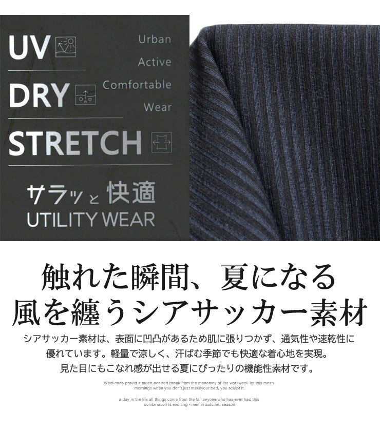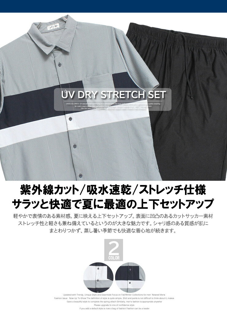 夏の快適セットアップスタイルセットアップ メンズ 大きいサイズ カットサッカー ドライ 切替デザイン ストレッチ 半袖シャツ ショートパンツ SPEC 説明 清涼感も洒落感もこれ一着で。