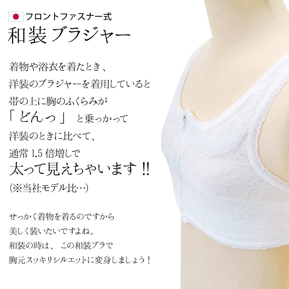 着物や浴衣を着たとき、洋装のブラジャーを着用していると帯の上に胸のふくらみが「どんっ」と乗っかって洋装のときに比べて、通常1.5倍増しで太って見えちゃいます!!(