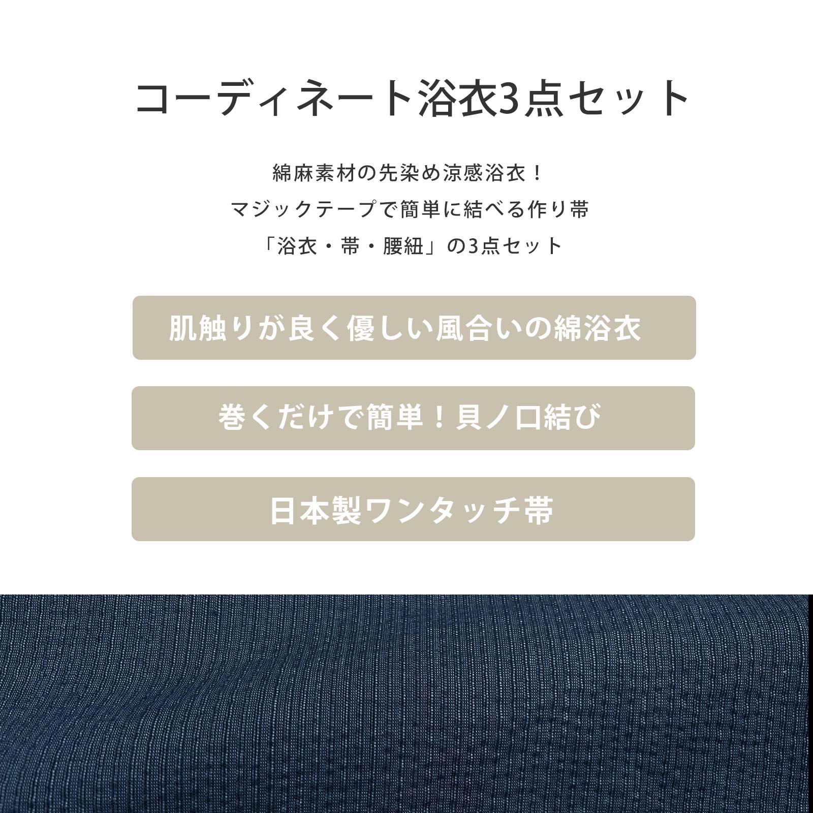 ※地紋は、おまかせとなります 〇腰紐 締めやすい当店オリジナル腰紐 商品について○浴衣 Mサイズ:身丈約142cm、袖丈約50cm、裄丈約70cmLサイズ:身丈約144cm、袖丈約51cm、裄丈約73cm LLサイズ:身丈約148cm、袖丈約52cm、裄丈約75cm 綿85%、麻15%/生産国:中国製 ○帯 巾:約11cm、長さ:約250cm ポリエステル100%/生産国:日本製 〇腰紐 寸法:長さ約218cm、幅約4.5cm 素材:ポリエステル80%、綿20% 注意点 商品は、「浴衣、帯、腰紐の3点セット」になります。