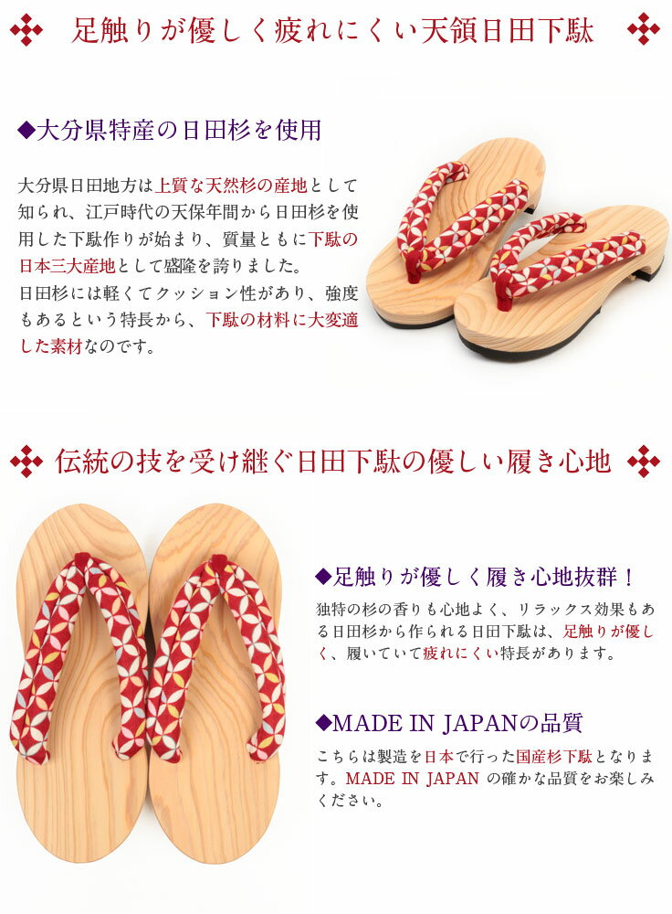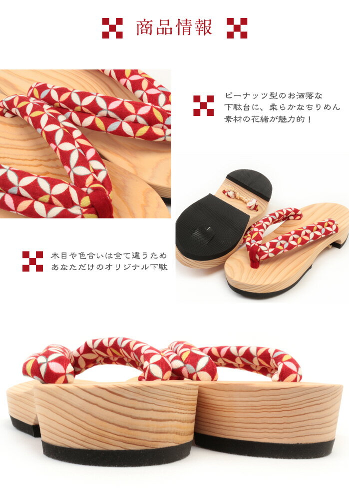 商品情報 色 花緒:レッド 柄 花緒:七宝 素材 杉(大分県/日田杉使用) サイズ フリーサイズ 長さ:約23.8cm 幅:約7.5〜9.0cm 高さ:約3.8cm (つま先〜前坪:約3.5cm 前坪〜かかと:約19.5cm) 製造 日本製