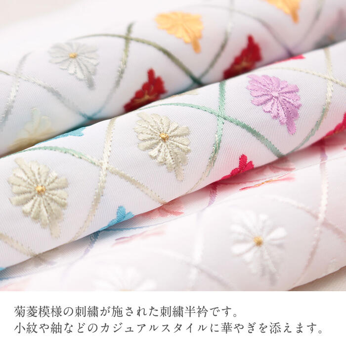 ◆合わせる着物◆ 色無地 小紋 紬など ◆こんなシーンに◆ 春 秋 冬 着物でのお出かけに ◆色◆ 全3色 ◆柄◆ 菊菱 ◆素材◆ 生地:ポリエステル100% 刺繍糸:レーヨン100% ◆製造◆ 日本製 ◆備考◆