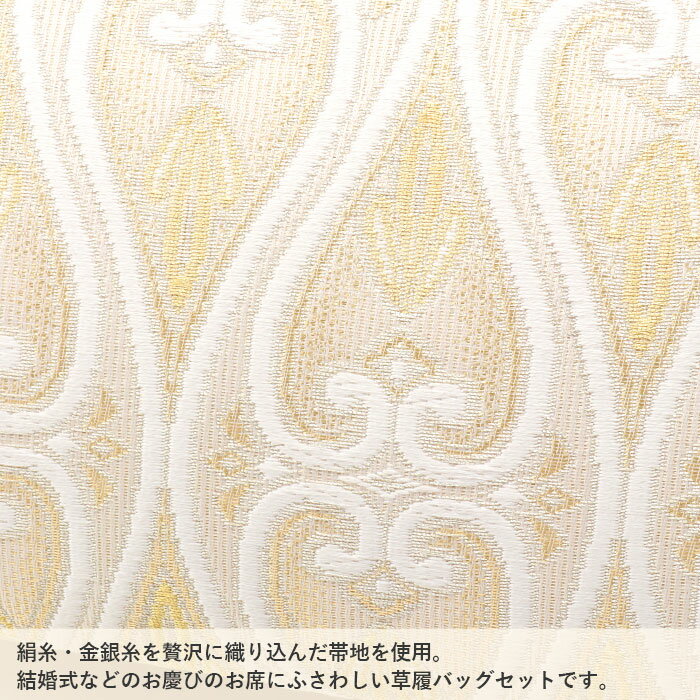【草履本体】:ゴールド・アイボリー・ホワイト ◆柄◆ 変り立涌 ◆バッグサイズ◆ 高さ:約14.5cm 幅:約24.0cm 奥行き:約11.0cm (持ち手含む総高さ:約28.0cm) ◆草履サイズ◆ Lサイズ (適応サイズ:23.5〜25cm) 長さ:約24.2cm 幅:約8.0cm 高さ:約5.5cm (つま先〜前坪:約4.5cm 前坪〜かかと:約19.7cm) ◆素材◆