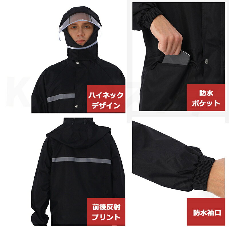 商品名 レインウェア 商品番号 q69 カラー ブラック 商品仕様 サイズ:写真参考 素材:オックスフォード 商品詳細 背中に反射テープ加工されており、夜道でも安全に!! ファスナー式のシールを採用しています。