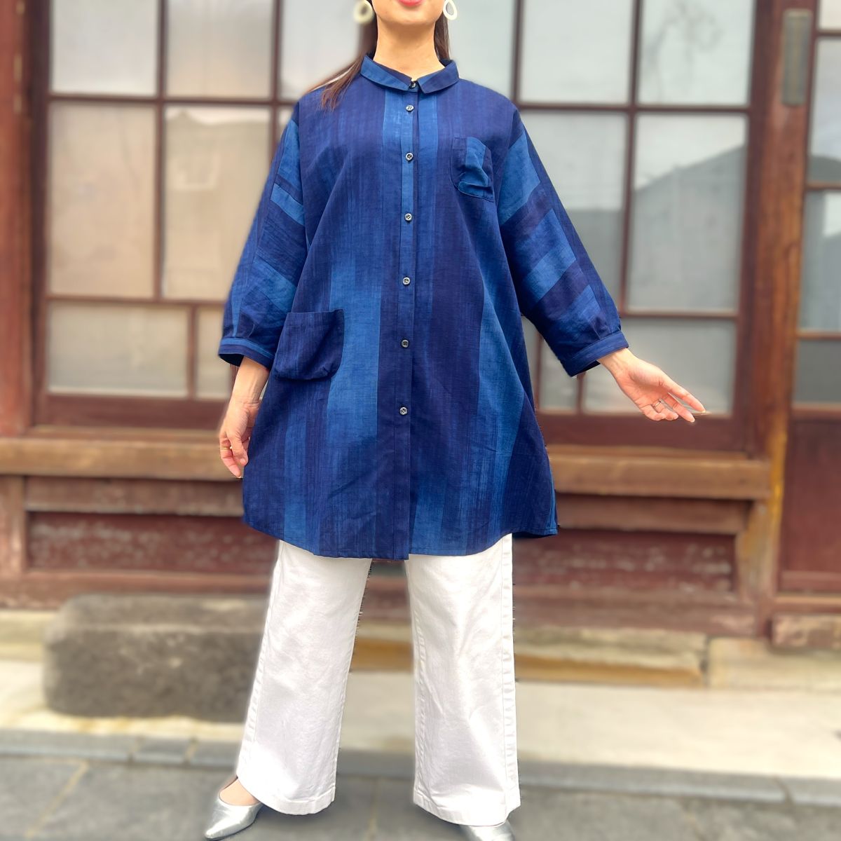 【久留米絣チュニック】ミセス50代60代70代レディース綿100%7分袖春夏秋冬和風和柄ミセスゆったり久留米絣書生柄濃紺ネイビー茶色ブラウン襟付き前開きビッグシルエット 伝統の生地を楽しむ一枚〜送料・ラッピング無料 着るほどに肌なじみを増す丈夫な織物久留米で仕立てております。