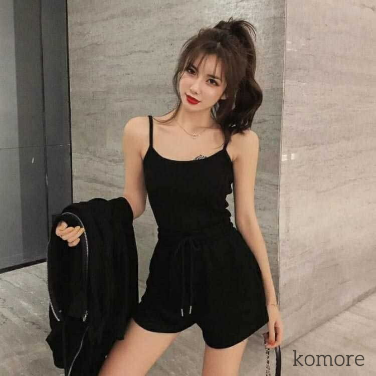 キャミソールxジップアップパーカーxウエストゴムパンツの3点セット。
