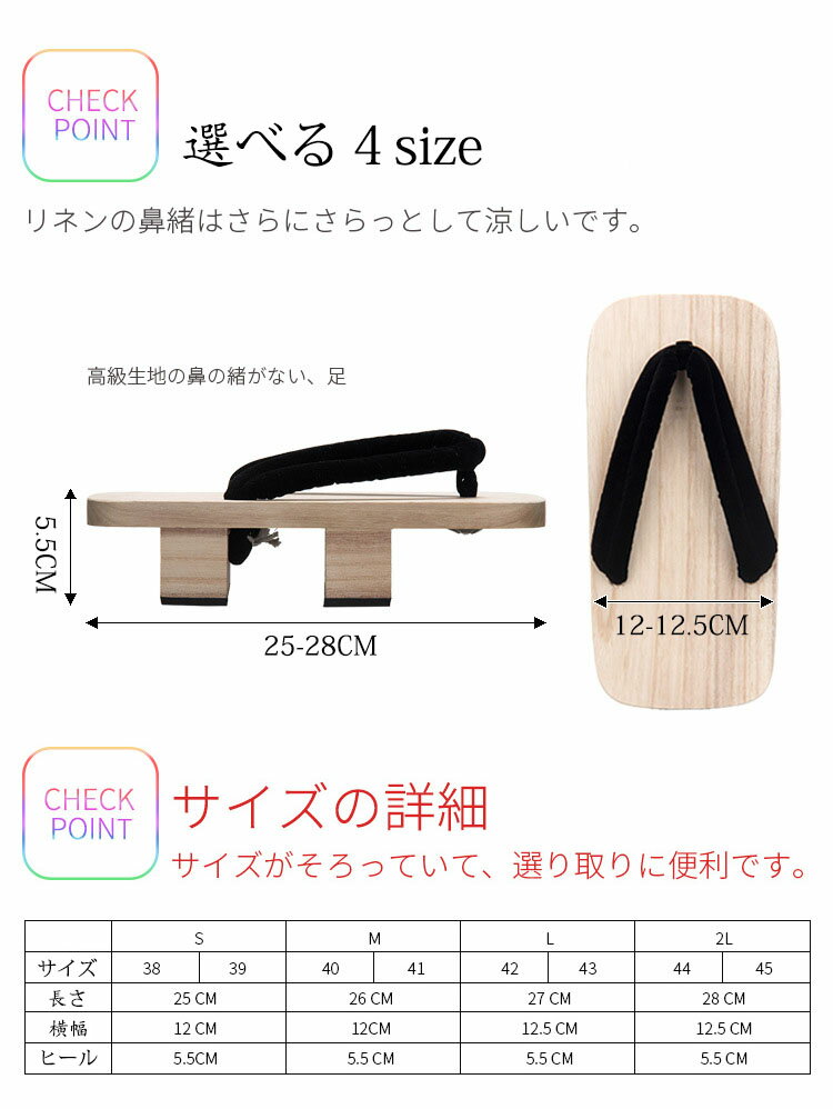 ※長さ約25-28CM、横幅約12-12.5CM、ヒール約5.5cm 素材:本体(白木桐)/鼻緒(表:綿、裏:ポリエステル)