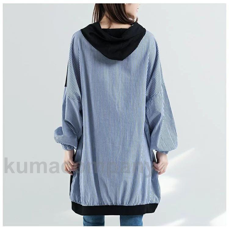 【商品説明】:レタリングプリントパーカー レディース パーカー 大きいサイズ 長袖 春秋 不規則 切り替え オシャレ きれいめ ストライプ カジュアル ロング丈Tシャツ