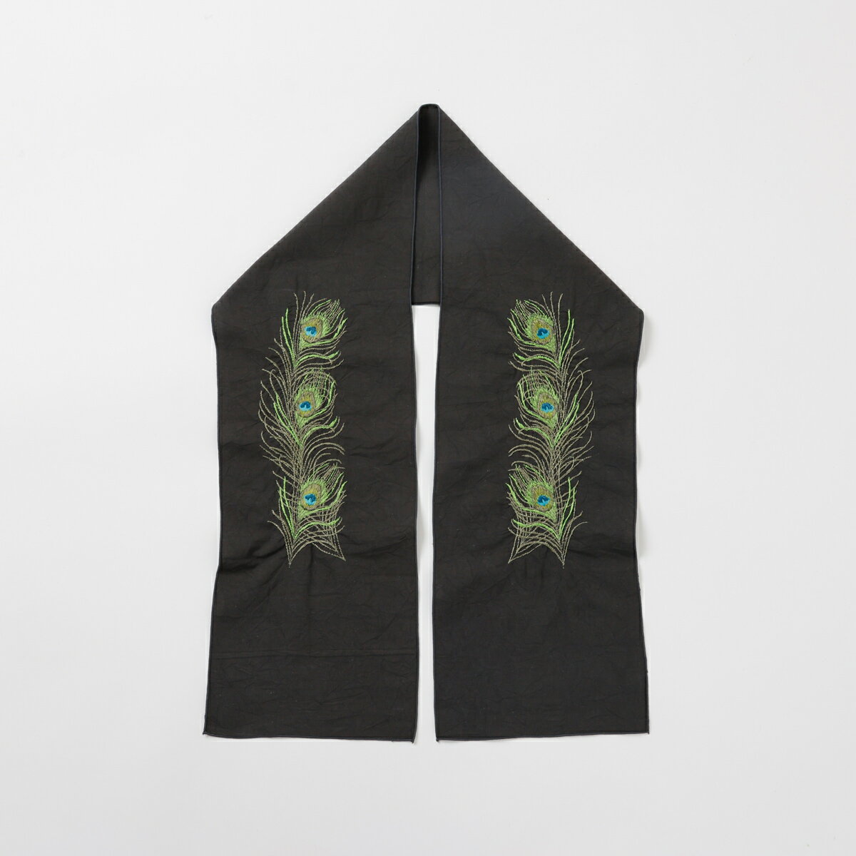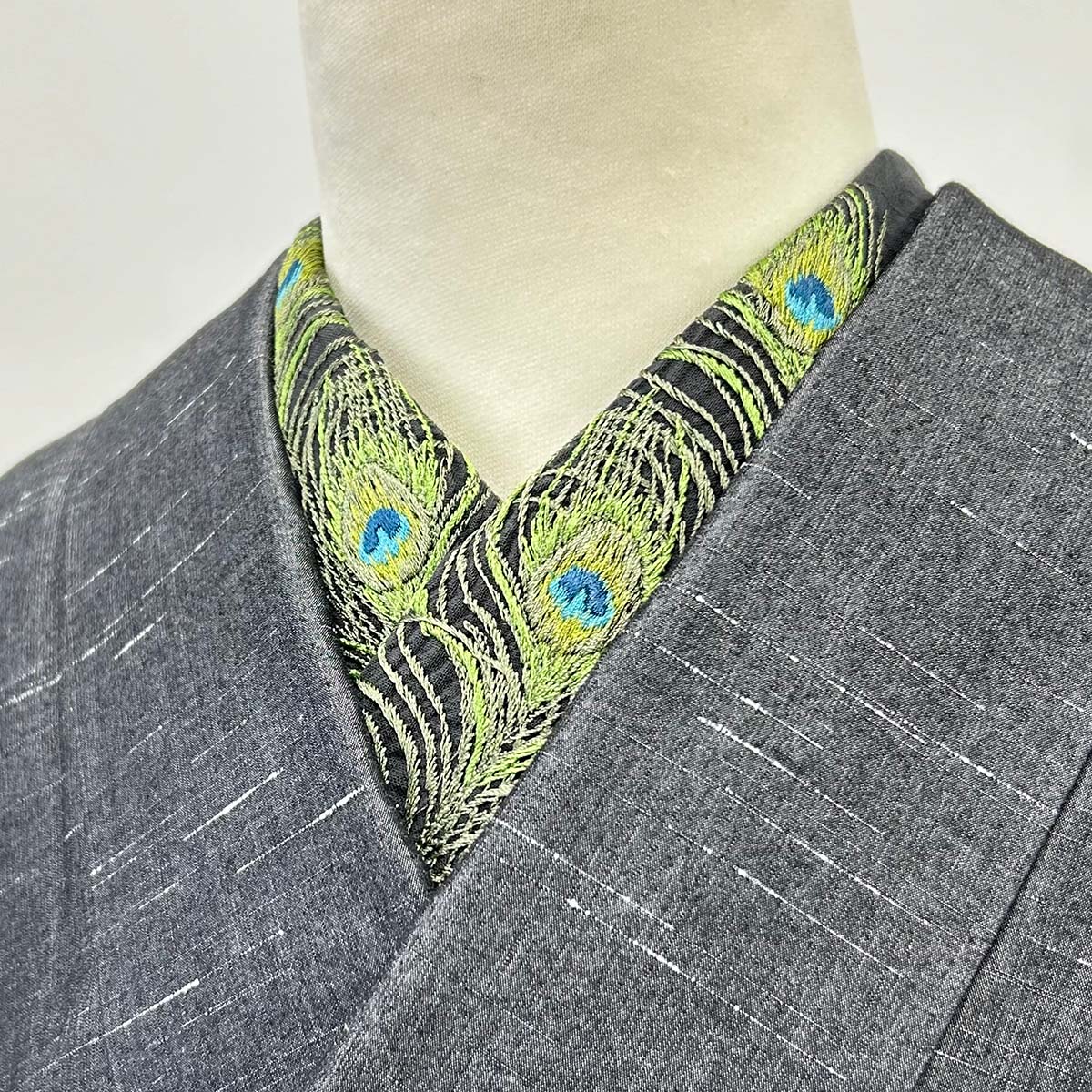 優雅な孔雀の羽 衿元を鮮やかに彩る刺繍半衿 ピーコックの目の部分を衿山に近づけるように折ることで、着物の衿元に優雅な華やかさを添えることができます。