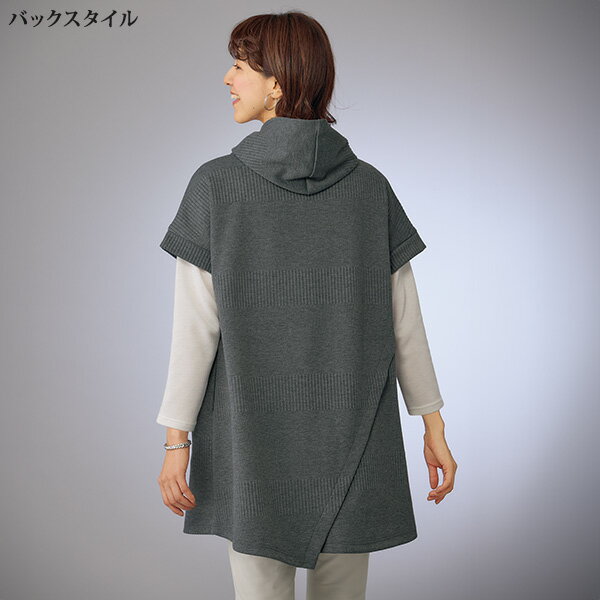 ベスト感覚のチュニックでスタイルアップ 斜め切り替えがおしゃれなフーディーチュニック。