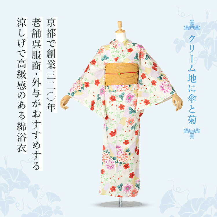 ブランド浴衣 キスミス 紺地に傘と菊 夏祭り・花火大会などで着ていただける「綿浴衣」をお届けします♪京都で創業320年の老舗呉服商が自信を持っておすすめする綿浴衣です。