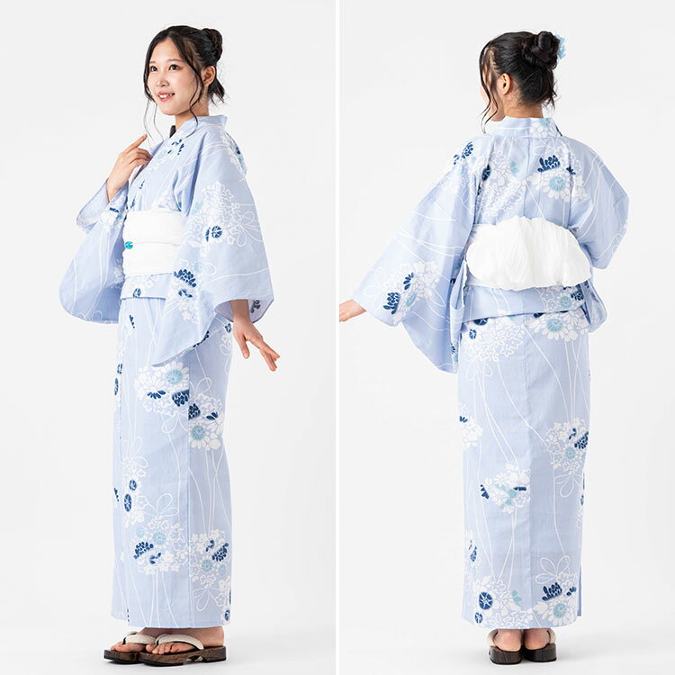 ■綿浴衣2点セット 水色地に花々(帯 白) 夏祭り・花火大会などで着ていただける「浴衣&半巾帯」の2点セットでお届けします♪京都で創業320年の老舗呉服商が自信を持っておすすめするオリジナルの綿浴衣セットです。