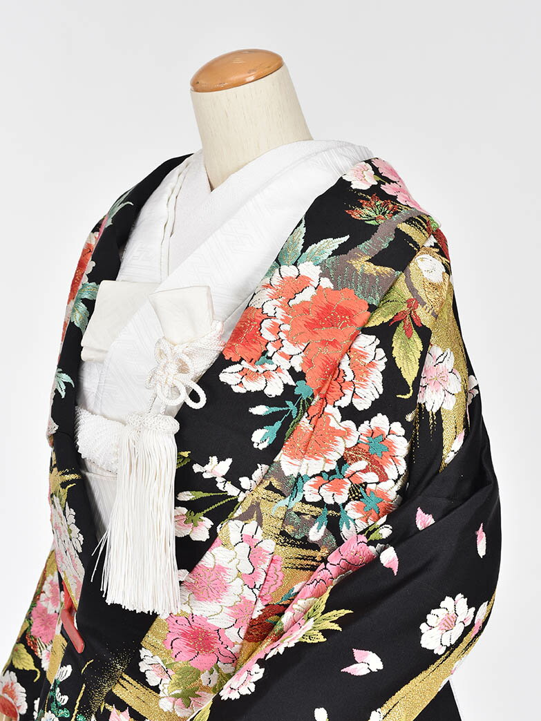 多色使いの花々が黒地に映え、豪華な金糸がお披露宴、写真撮影に映えます。