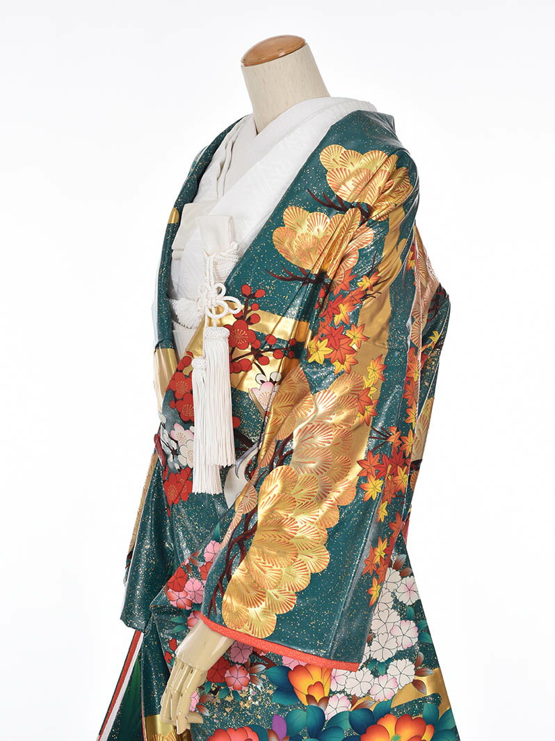 【レンタル】緑の地色に多色使いが個性的 金箔の豪華な友禅の打掛はお披露宴の花嫁さまを華やかに演出します! ご利用日の5日前にお届けします。