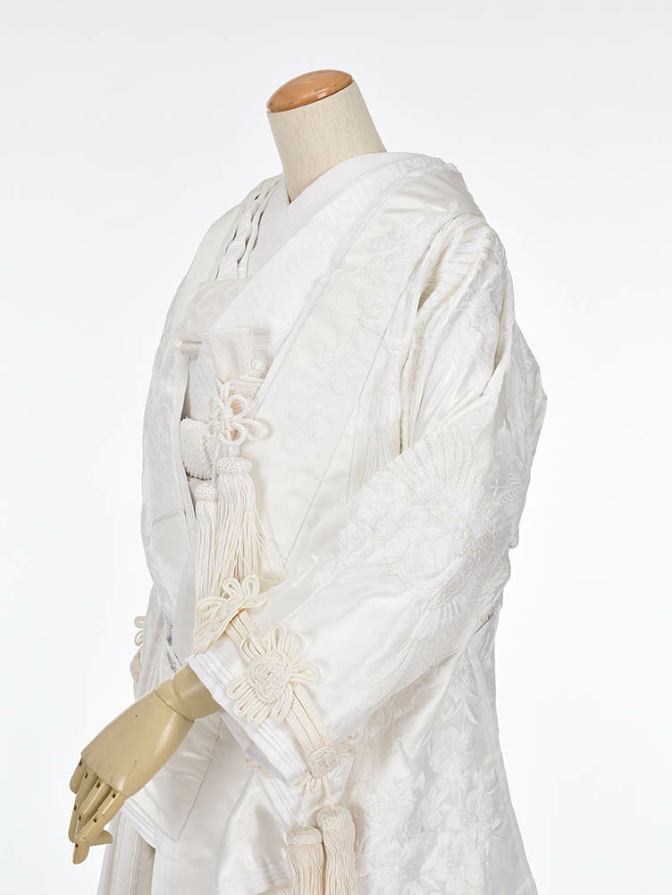【レンタル】白無垢 花嫁衣裳 和装 神社挙式 仏前挙式 結婚式 打掛 披露宴 綿帽子 和婚 鶴 フルセットレンタル 和装前撮り 往復送料無料 7日間レンタル 豪華な刺繍が目を引く 襟と袖の重ね飾りが豪華な白無垢です。