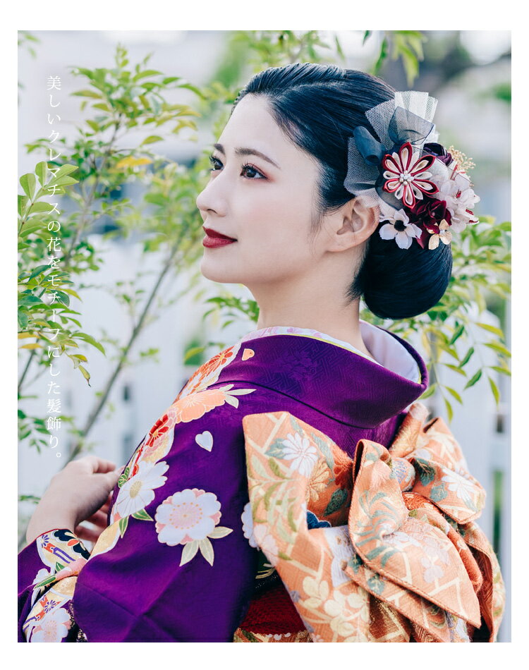 美しいクレマチスの花をモチーフにしたこちらのかんざしはつまみ細工の技法を用いて作らています。