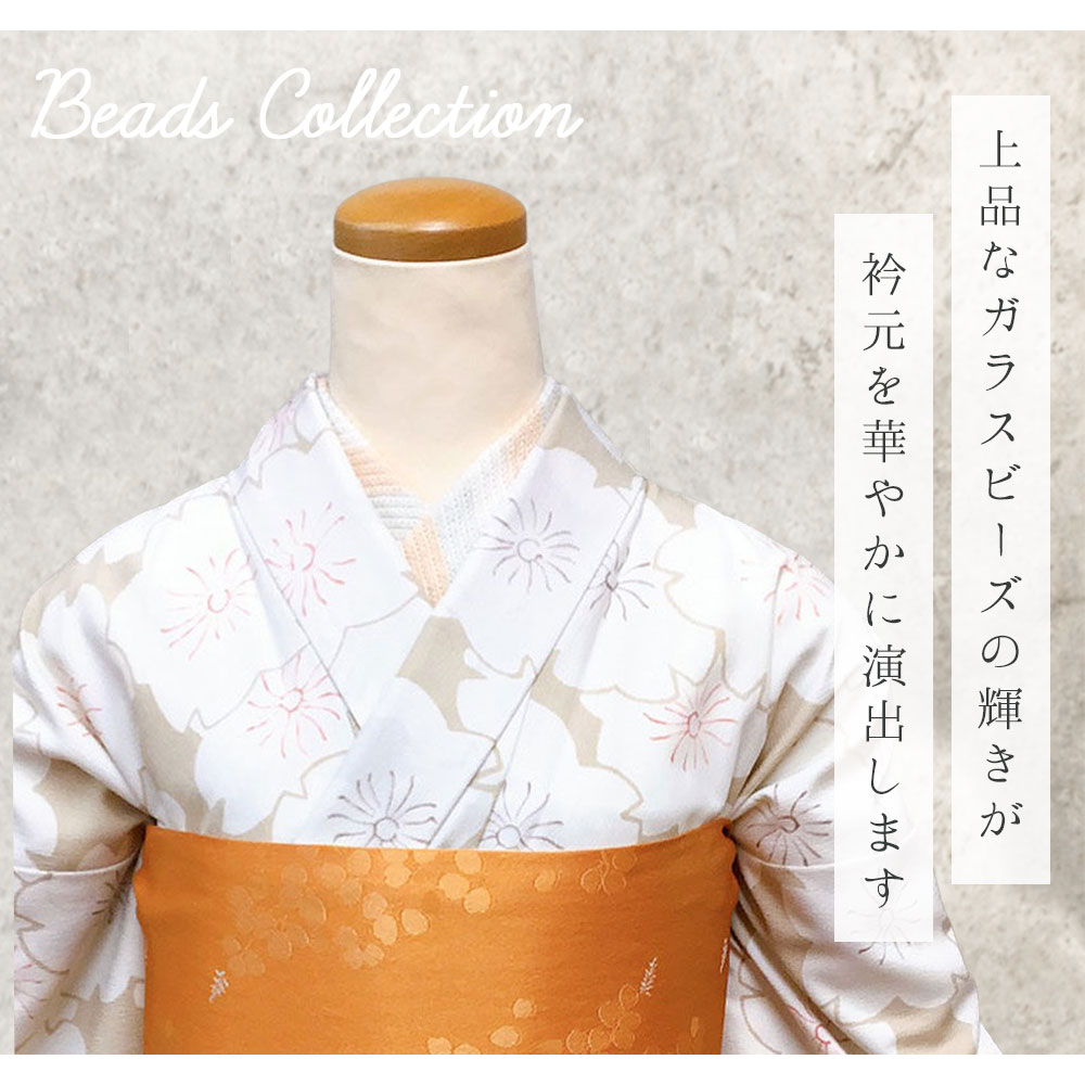 アクセントにもなりコーディネートの幅がグッと広がるビーズ半衿で、お着物のコーディネートをお楽しみくださいませ。