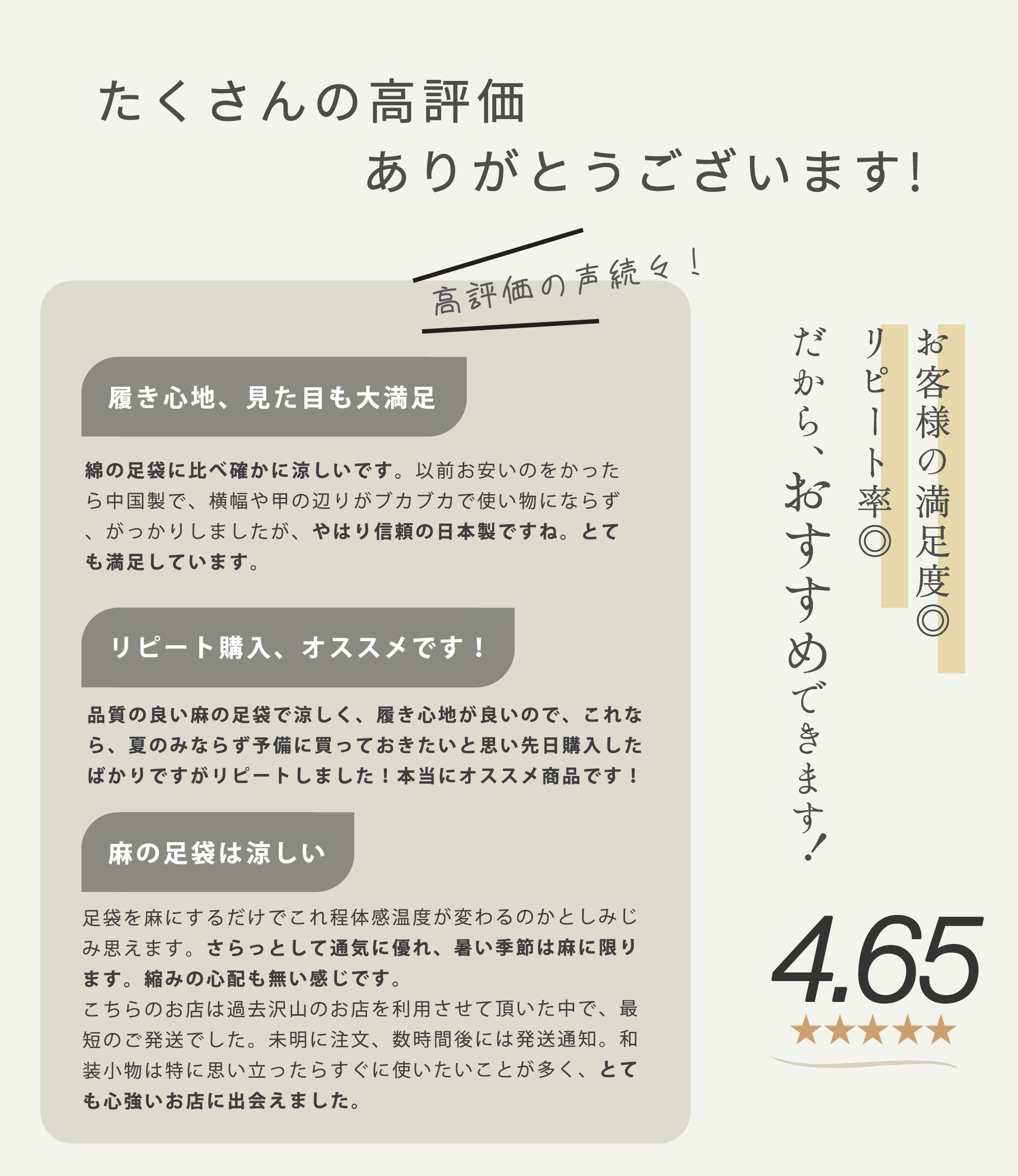 ■製造 日本製 商品説明 涼やかで快適な履き心地 本麻の足袋 暑い季節でも快適に過ごせる、本麻素材を使用した足袋です。