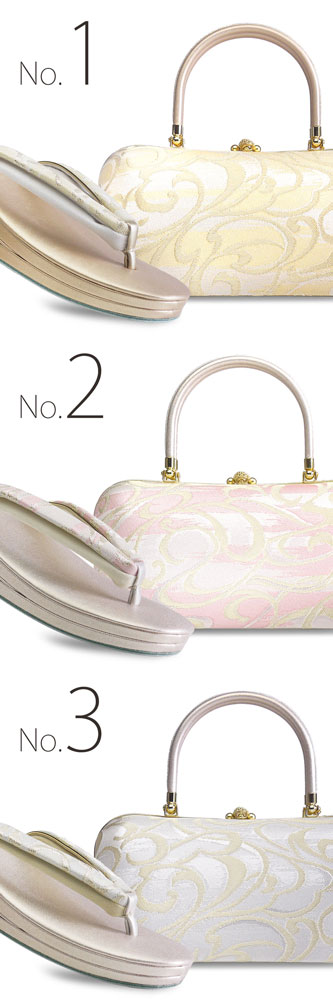 こちらは3色のそれぞれ上品な地色に、光を映す金属糸の唐草模様が描かれています。