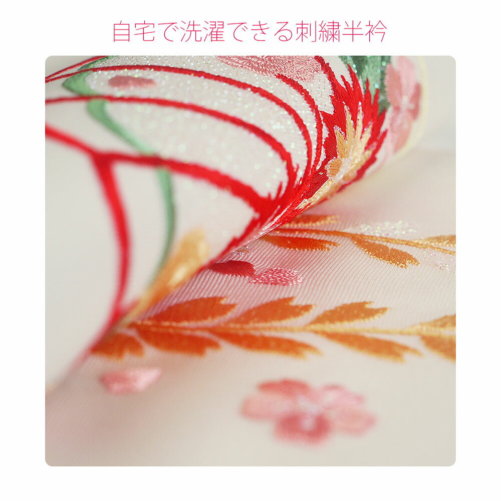 京都発 洗えるオシャレ刺繍半衿絹に近い肌触りを目指した高級ポリエステルを使い、しなやかさと利便性を兼ね備えた刺繍半衿です。