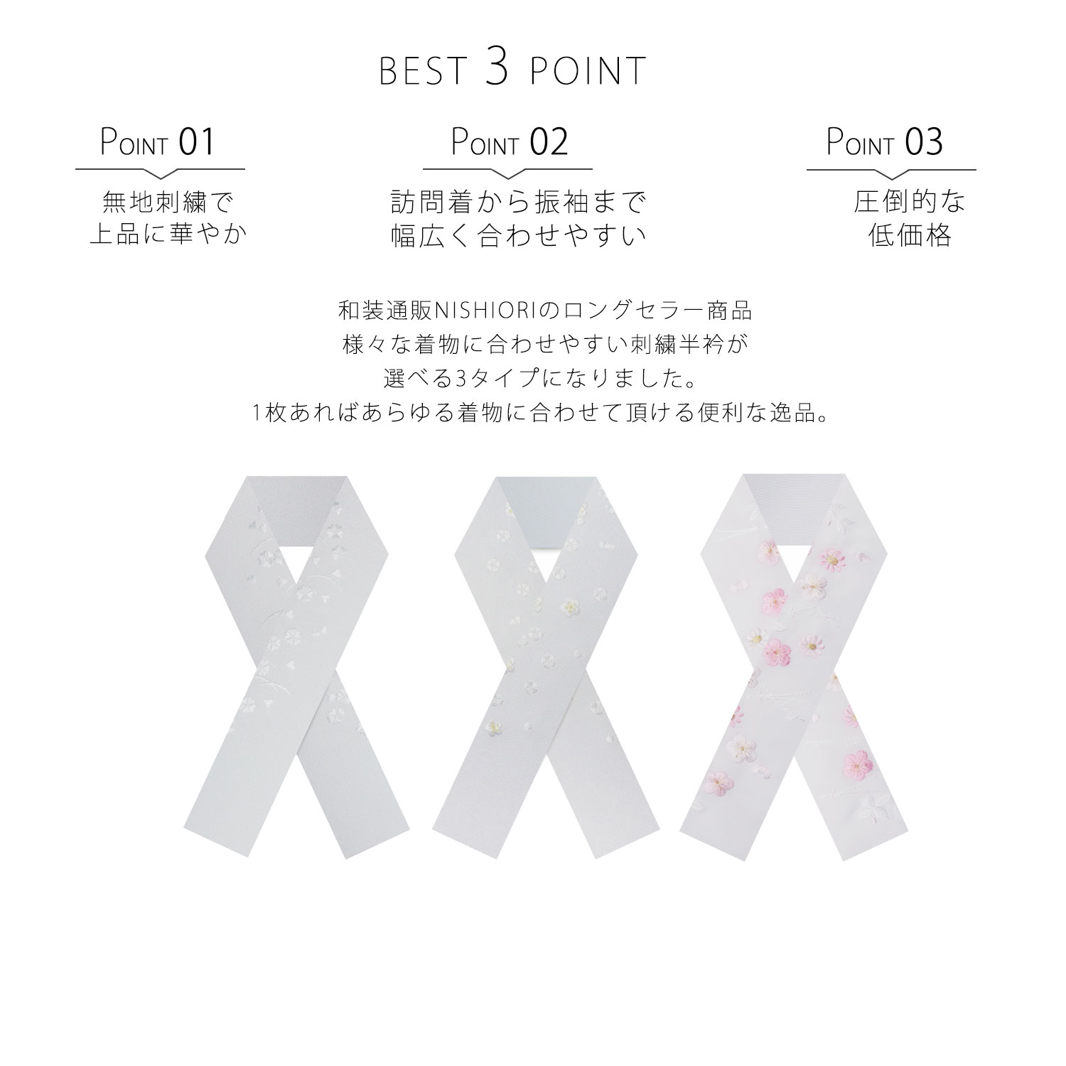 ・「白×白」 ・「白×金」 ・「白×ピンク」 お得な3枚セット 豪華な刺繍が可愛い半衿 シンプル上品な半衿だから、色々な用途にご使用いただける万能刺繍衿です。