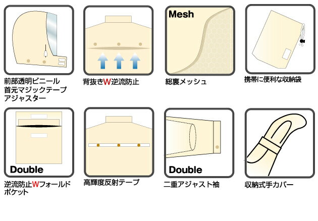 ■素材:表:ナイロン100% 裏:PVC高弾性コーティング :上下総メッシュ 総裏メッシュで着用時快適 反射テープ付きで夜間の安全確保 自転車乗車時に手元が濡れないカバー付き カラー&サイズ案内 ネイビー アイボリー 100 105 110 115 120 125 125 適用サイズ(単位:cm) サイズ 100 105 110 115 120 125 130 身長 145〜155 150〜160 155〜165 160〜170 165〜175 170〜180 175〜185 胸囲 72〜80 79〜87 79〜87 86〜94 93〜103 100〜108 100〜108