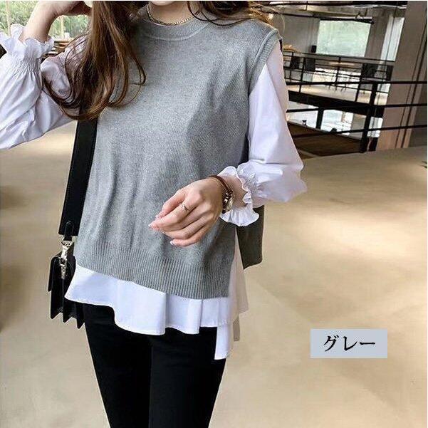 【ポイント】カジュアルガーリーなレイヤードスタイルがきまります!可愛いスタイルだけではなく、肌寒い春秋シーズンに最適なアイテム!袖口は緩やかなフリルデザインでフェミニン度格上げニットベストは程よい厚みでしっかりとした素材感で実用性も満載内側のブラウスはヒップラインまでのちょうどいい丈感で気になる体形も気にせず安心して着用いただけます。