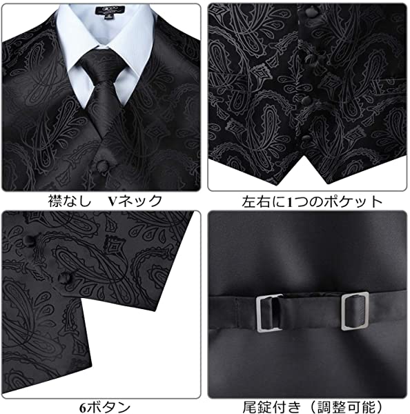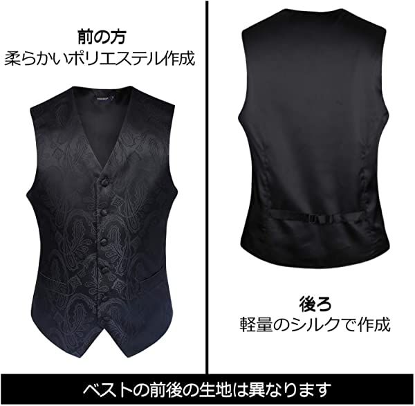 ■ 黒 スーツベスト メンズ ブラック 柄 チョッキ ベスト ネクタイ チーフ セット 6ボタン ビジネス 結婚式ベスト 紳士フィット尾錠付き S メイン素材: ポリエステル80%/シルク20%素材構成: 80% ポリエステル, 20% シルク