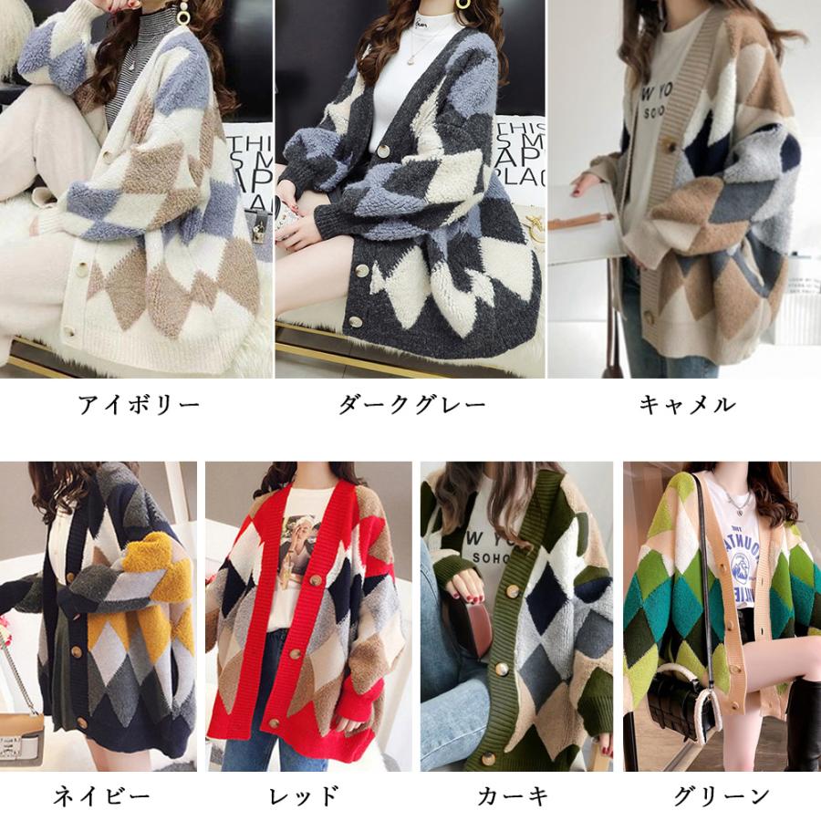素材:アクリル100%カラー:キャメル/ネイビー/アイボリー/ダークグレー/カーキ/グリーン/レッドサイズ:ワンサイズ着丈:約70cm 肩幅:約68cm 袖丈:約41cm ゆき:約75cm 身幅:約62cm 胸囲:約124-160cm裏地:なし伸縮性:あり透け感:なし生産国:中国アーガイル柄 ニットアウター vネック 中厚手 長袖ニットソー 体型カバー羽織 お洒落カーデ カジュアル 女子ニット明るい配色のひし形チェック柄が浮き出るもこもこボアでアクセントになるカーディガン暗くなりがちな秋冬では存在感抜群ながらも、季節に馴染みやすい色合いなので派手過ぎず着こなしやすいトップスシンプルなボトムスを合わせてコーデ達人に即変身できる主役級アイテム、少しメンズライクなゆったり感があって、お友達や恋人とのリンクコーデもおすすめメーカー希望小売価格はメーカーカタログに基づいて掲載しています