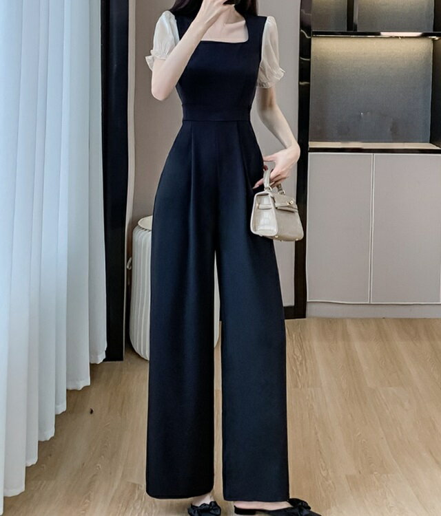 シフォン素材のパフスリーブが可愛い オールインワンパンツドレス。