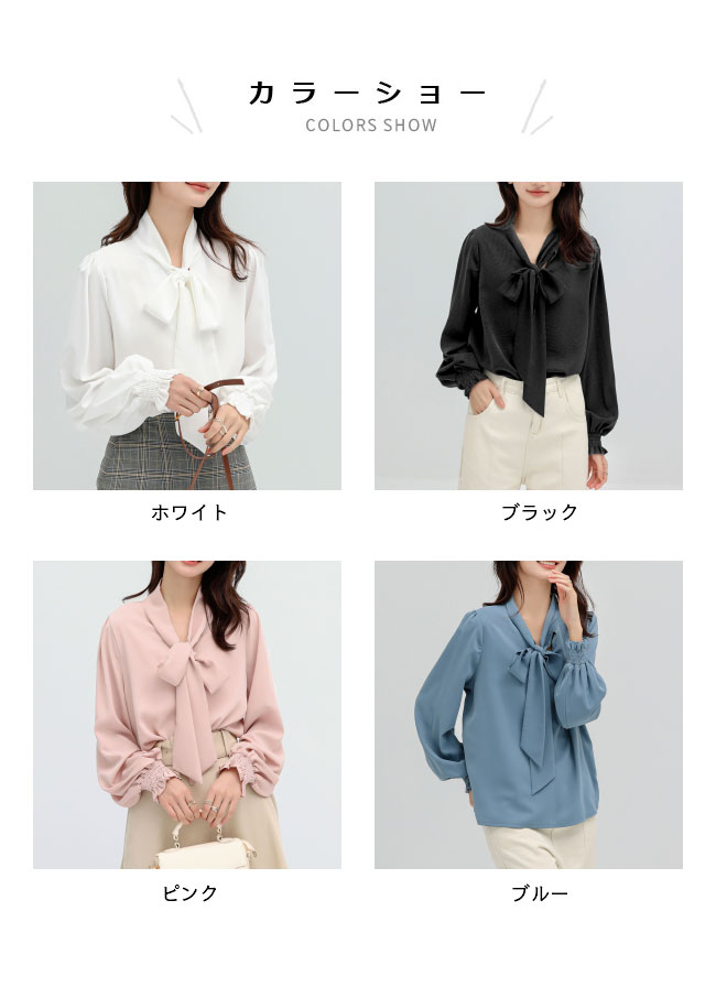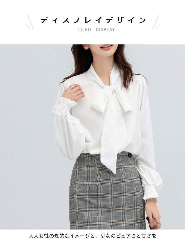 ■オフィスコーデにもカジュアルコーデにも似合い レディースとろみシャツ 大人女性の知的なイメージと、少女のピュアさと甘さを 両方演出してくれる、レディース長袖ブラウス 肌触り的にも見た目的にも素敵、ふんわりとろみ感のある生地感 ボウタイリボン付きのデザインが大人可愛いアクセントを付けました デイリーユースからセレモニーシーンまで活躍でき 優しい雰囲気で、女性らしさをぐっと上げてくれるアイテム メインとしても、コートやカーディガンなどと重ね着しても 合わせるアイテム次第でロングシーズンで着こなせます