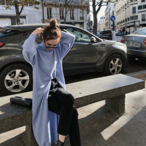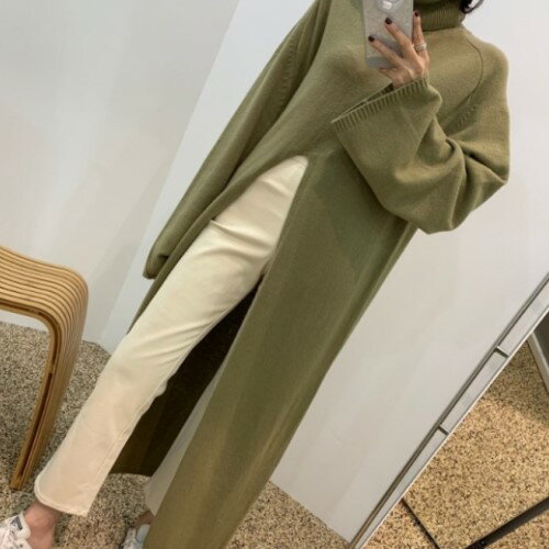 在庫切れの際はすみやかに返金処理させていただきますフロントのディープスリットがトレンドのロング丈ニットトップス。