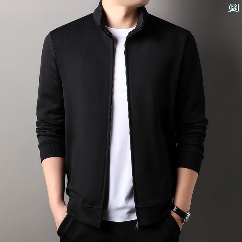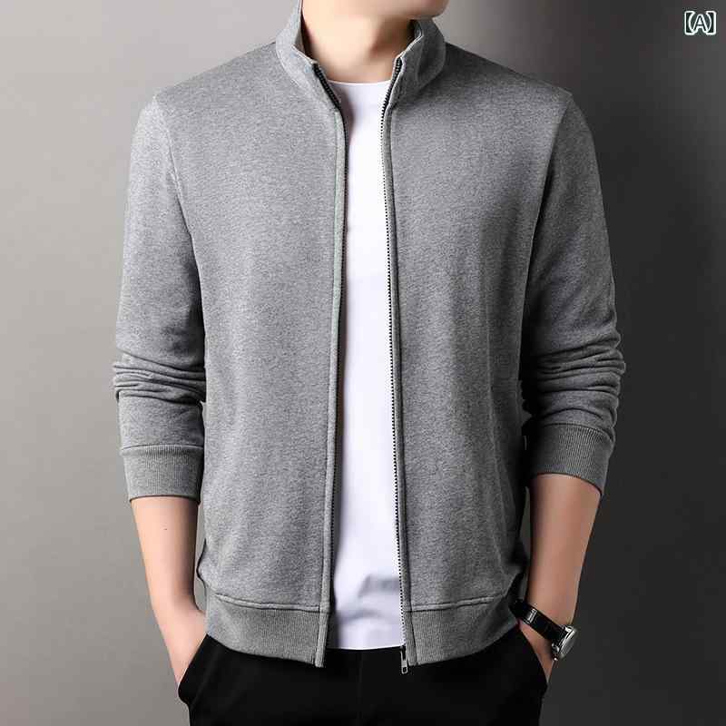 メンズ スウェット スタンドカラー カーディガン 春秋 薄手 長袖 コットン 無地 トップス スポーティ カジュアル 普段使い 部屋着 グレー ブラック ネイビー ブルー オレンジ グリーン