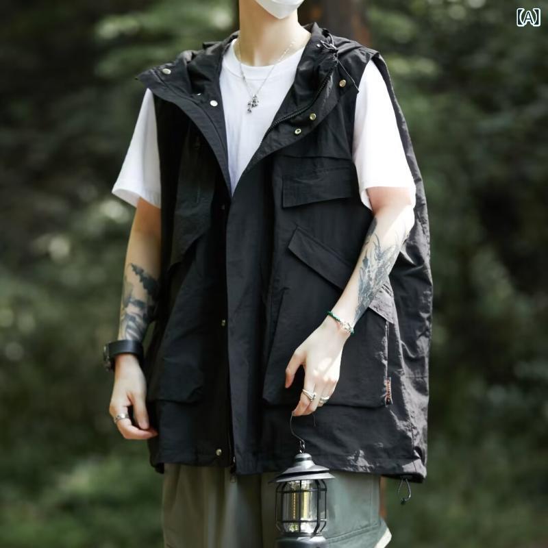 メンズ 作業着 ベスト ストリート系 トップス ポケット付き ノースリーブ ジャケット 上着 チョッキ ポリエステル ブラック 紺色 夏・カテゴリ: ベスト