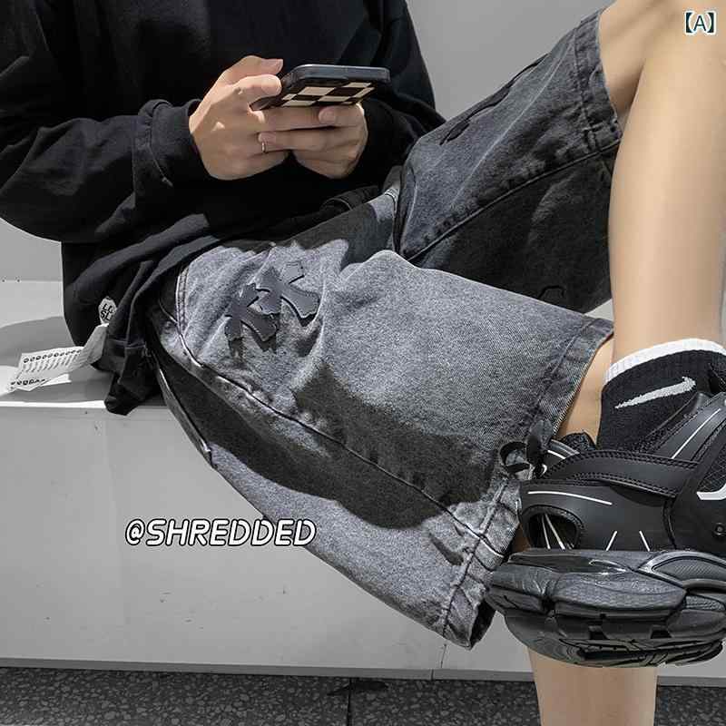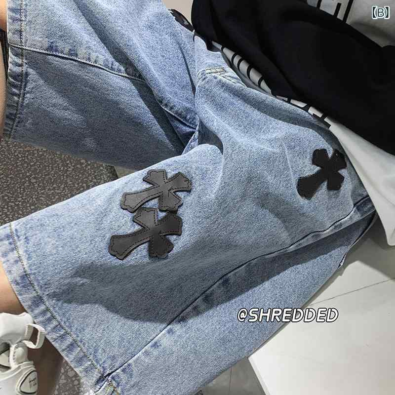デニム メンズ ハーフパンツ ゆったり ストレート 十字架 パッチワーク 10代 20代 ジーパン Gパン カジュアル ブラック ブルー
