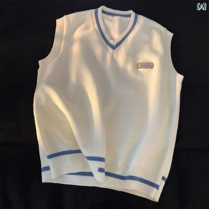 ニットベスト 男性用 Vネック レイヤードスタイル ゆったり 春秋 ポリエステル ホワイト ブラック ブルー ピンク系