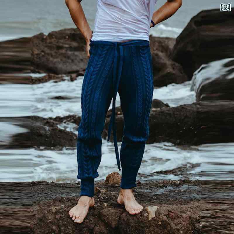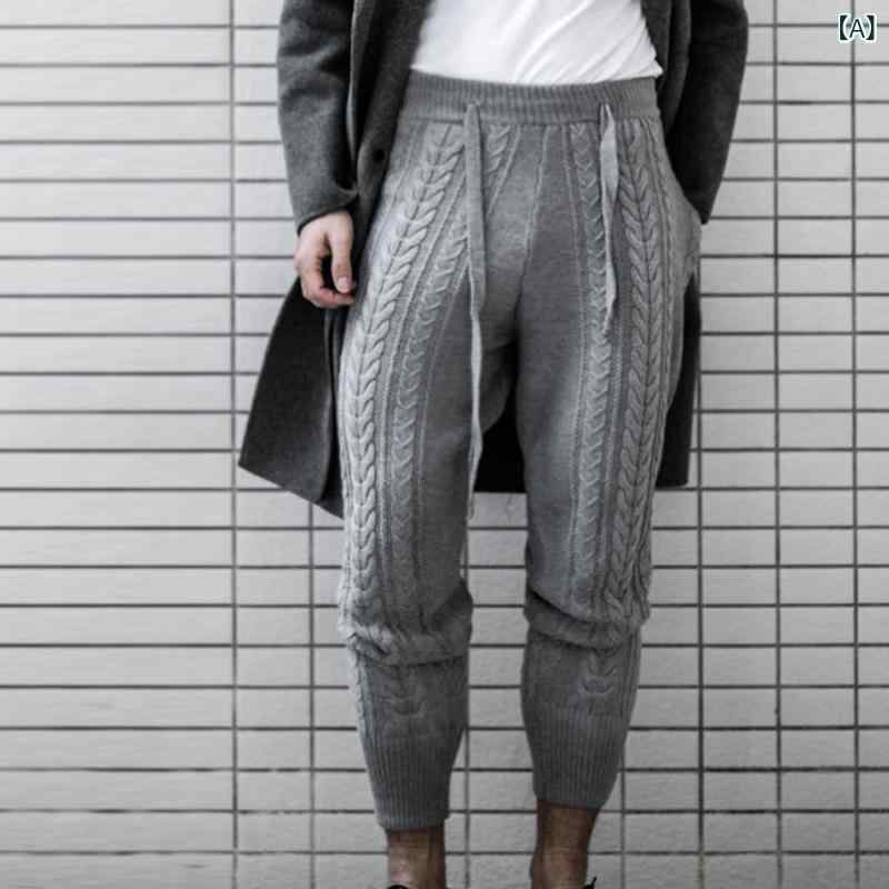 ニット ズボン 男性用 リラックス ロングパンツ 中間ウエスト 無地 伸縮性 ポリエステル 普段使い 部屋着 グレー 紺色